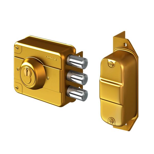 Cerradura de sobreponer Forte Blindada 300 con tres barras de acero y 3 golpes de seguridad, cilindro Forte reforzado con disco, contrapin, resortes y billas de acero y elementos que dificultan la vulneración con pata de cabra, taladro y ganzúa para complementar la seguridad en puertas de madera y metal