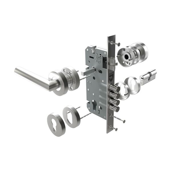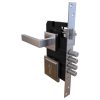 Cerradura de embutir de 2 golpes de seguridad, con picaporte en acero inoxidable, manija modelo estándar y cilindro con sistema multipunto con 5 llaves, manija para puerta derecha.